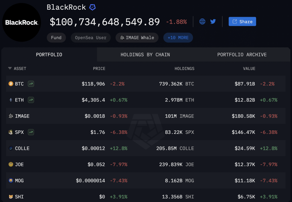 BlackRock is the world’s largest asset supervisor, with over $4.74 trillion in property below administration (AUM). Per HedgeFollow, its prime holding is Apple inventory (AAPL), at $253.27 billion. Now, its crypto holdings have exceeded $100 billion, making it the fifth-largest holding, overtaking Meta (META), through which it holds $95.89 billion value of inventory.