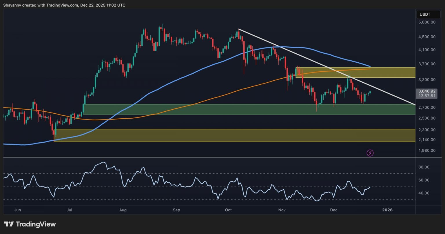 The worth is now testing the identical $3,000 degree, which has beforehand triggered the final sell-off. If consumers can flip that zone into assist, one other bullish leg towards the $3,400–$3,500 zone might be anticipated. Nonetheless, failure right here would possible drag ETH again towards $2,900 and certain beneath the channel as soon as extra.