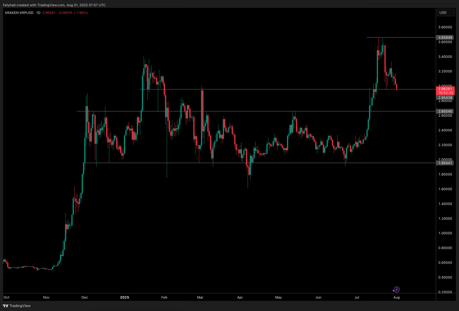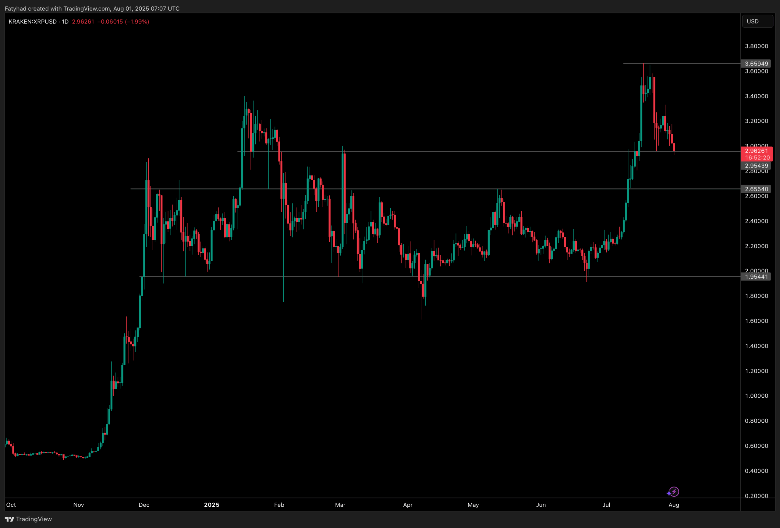 On the identical time, XRP price is retesting a key help zone round $2.95. After peaking close to $3.66, XRP has pulled again to this horizontal stage first examined in March and Might. If consumers defend $2.95, XRP may rally again towards $3.20 or larger. However a break beneath may ship value all the way down to the following flooring close to $2.65.