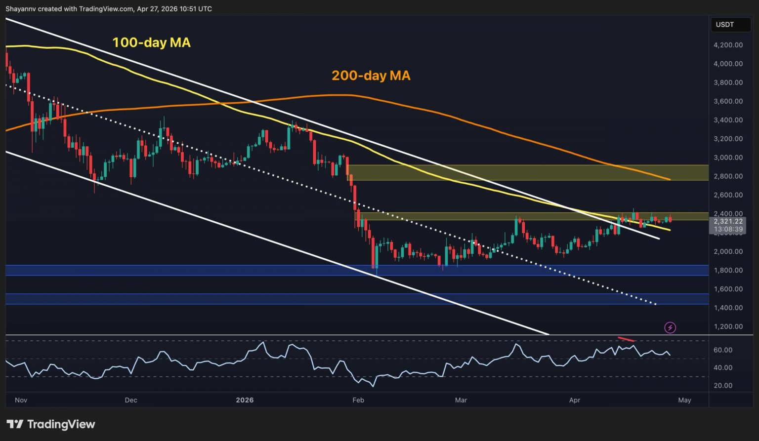 Ethereum is buying and selling above $2.3k as April attracts to an in depth, ending the month in a frustratingly acquainted place. It’s urgent towards the identical $2.4k resistance zone it has now examined repeatedly since mid-March and not using a clear decision. ETH sits on the threshold of what might both be its most important breakout in months or one more rejection on the gate.
