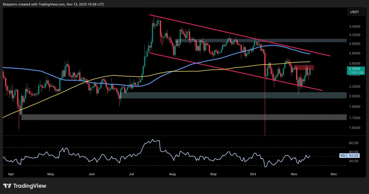 On the USDT pair, XRP is pushing right into a crucial bearish order block round $2.50 after bouncing from the $2 demand space. The construction remains to be compressed inside a descending channel, a sample that sometimes suggests a breakout will comply with.