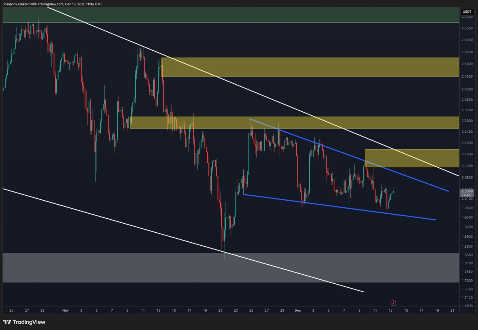Above present ranges, the $2.25 to $2.50 zone stays essentially the most essential resistance space. This area represents a former consolidation vary and overlaps with the descending trendline, creating a powerful confluence that sellers are more likely to defend.