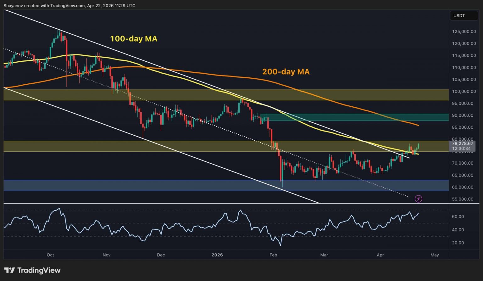 The every day chart is telling a distinct story than it was even every week in the past. BTC has lastly damaged above the descending channel, cleared the 100-day MA round $75k, and is now pushing by way of the $75k–$80k resistance band, with the RSI additionally on the rise however not overbought but. Crucially, what makes this transfer stand aside from earlier makes an attempt is that worth is not only tagging resistance and fading. The worth is grinding by way of the availability zone with successive increased closes.