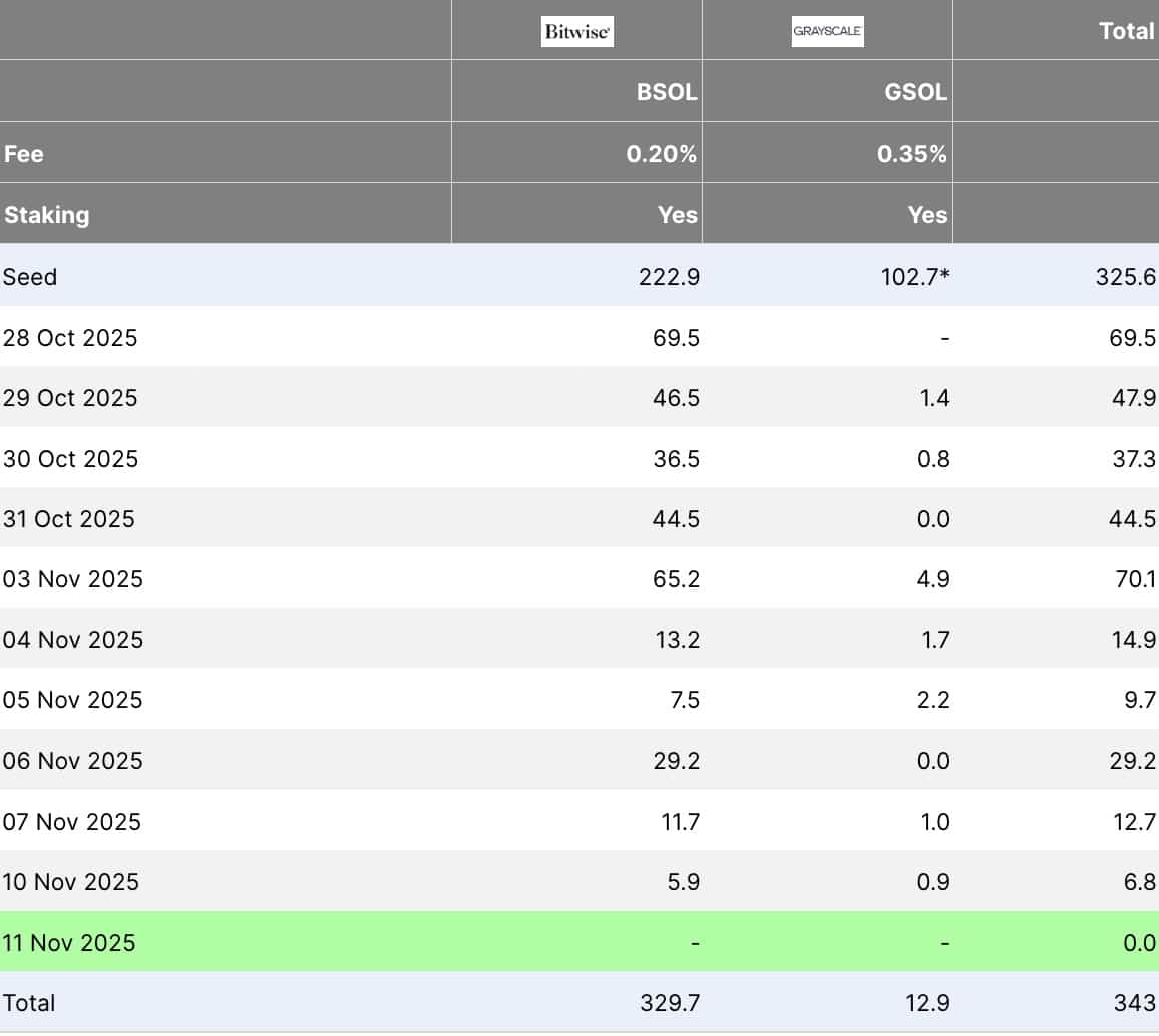 Ten straight days, contemporary money each session: Wall Road continues to purchase US spot Solana ETFs. Bitwise’s BSOL and Grayscale’s GSOL posted their tenth day of internet inflows on Monday, November 10.