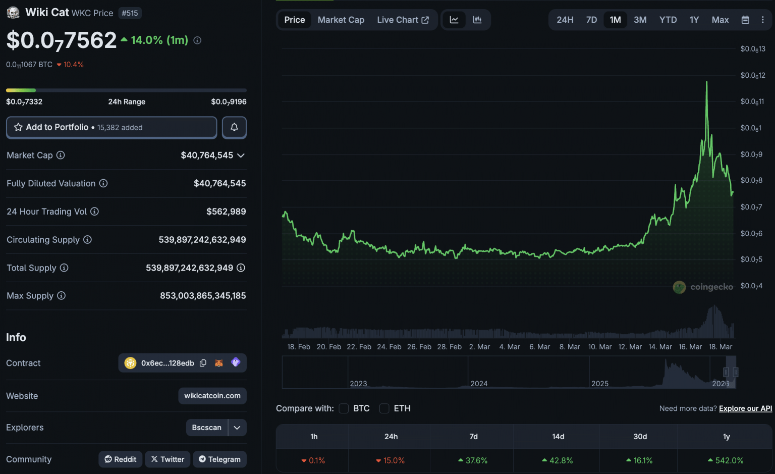 Wiki Cat – $WKC reclaims $40M in Mcap as @binance Cat Meme reignites requires itemizing. pic.twitter.com/XDqiOHU5VP— SMC Researchers (@SMCResearchers) March 15, 2026