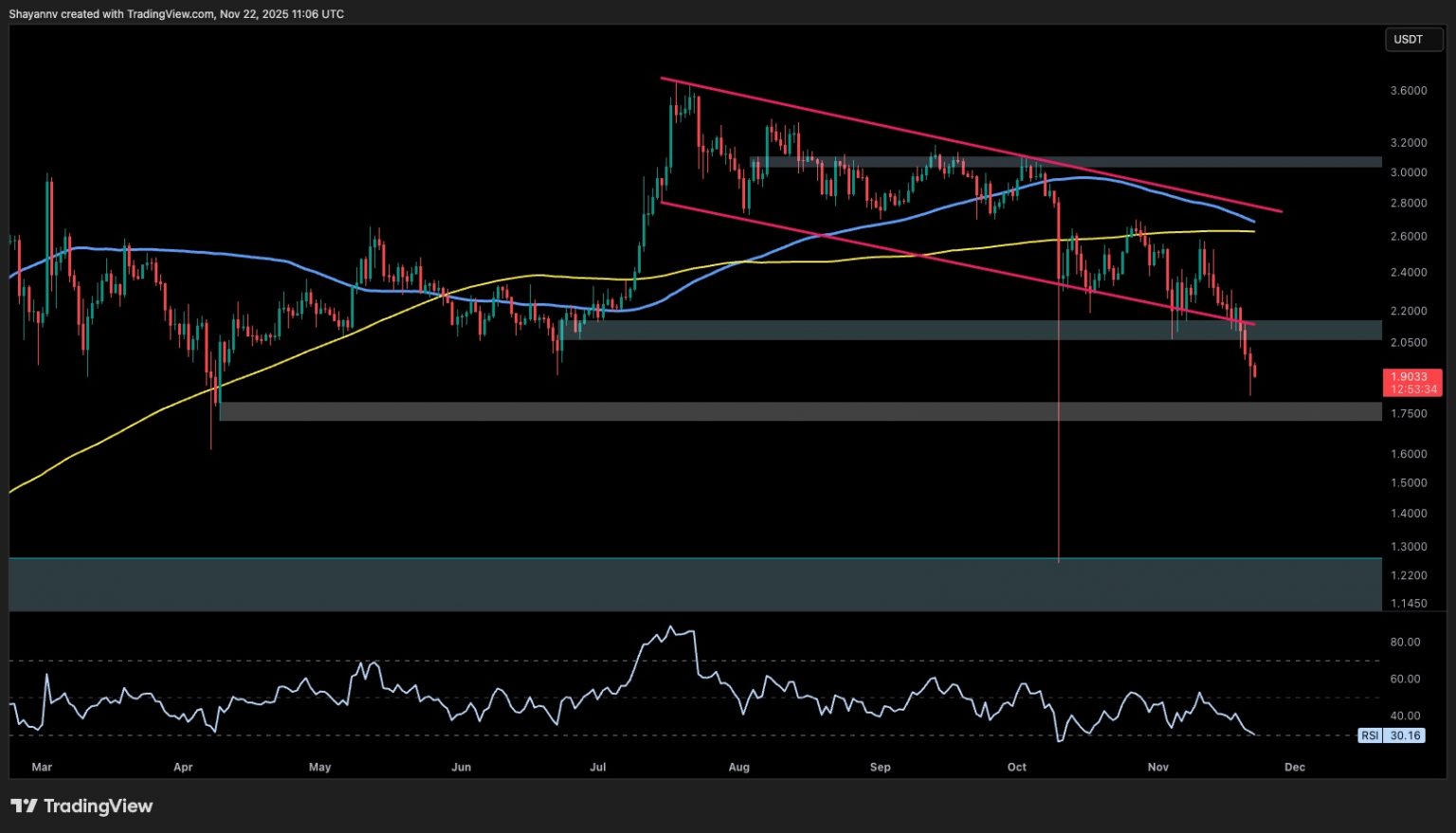The RSI can also be nearing oversold ranges, at the moment round 30, which can recommend a short-term bounce. Nonetheless, with out reclaiming the $2 stage, the construction stays bearish. If promoting strain continues, the subsequent draw back goal lies close to the $1.50 vary.